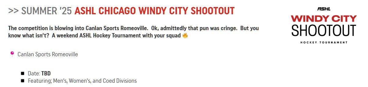 Illinois – Jul 5 – 6 – Adult Safe Hockey League – Windy City Shootout – ChicagoJuly 31, 2025Tags:#banff#bell Sensplex Ottawa#burlington wave hockey#canadian hockey enterprises#canlan sports#hockey tournament#kmha Kamloops#MEN#onehockey#ontario hockey tournaments #hockey in las vegas#oyster cup#weekend hockey tournament#womenadult Lifetime Views: 595 Upcoming ASHL Tournaments